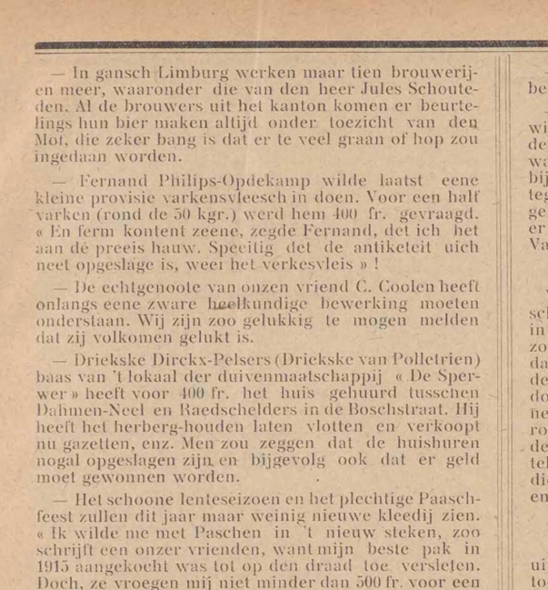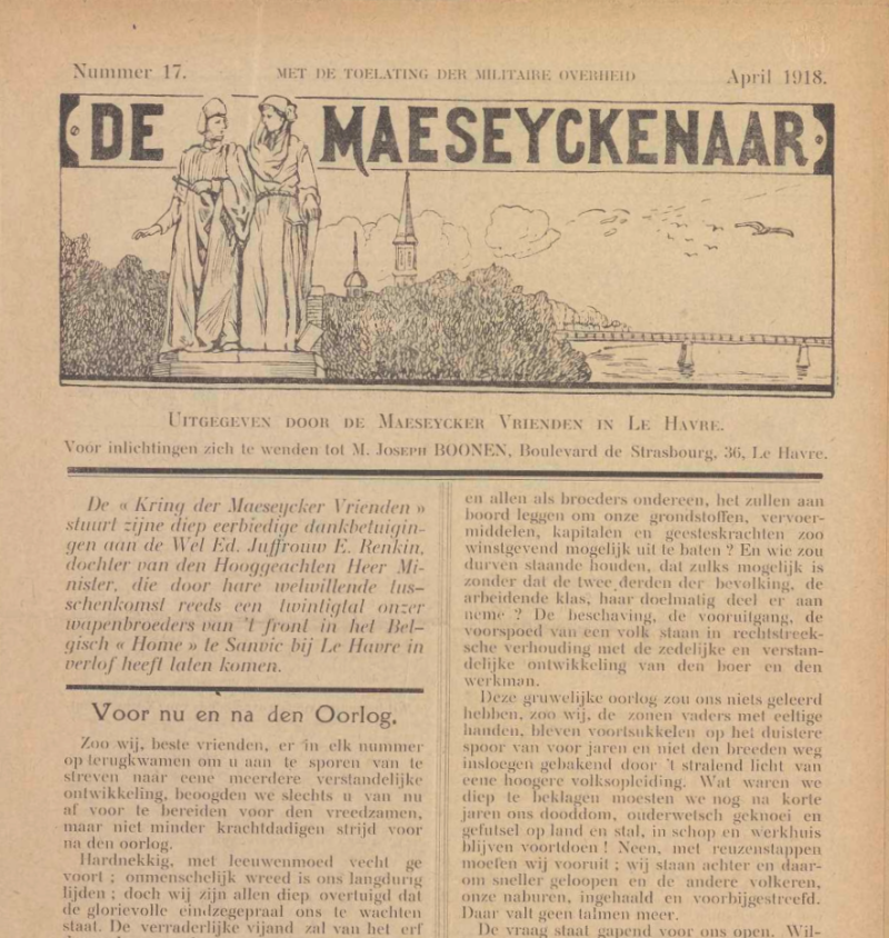 Artikel over Driekske van Polletrien in 'De Maeseyckenaar' uitgegeven door de Maeseycker vrienden in Le Havre. Nr. 17 - April 1918. Foto van Driekske voor zijn krantenkiosk op de Markt.